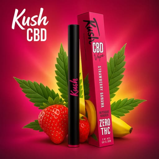 Vape Pen za jednokratnu upotrebu Kush CBD Vape Strawberry Banana sadrži 40% (200 mg) CBD-a i prirodne terpene iz sorte kanabisa Strawberry Banana. Namijenjena je za inhalaciju i nudi slatkast, klasičan okus kanabisa s notama banane i jagode.