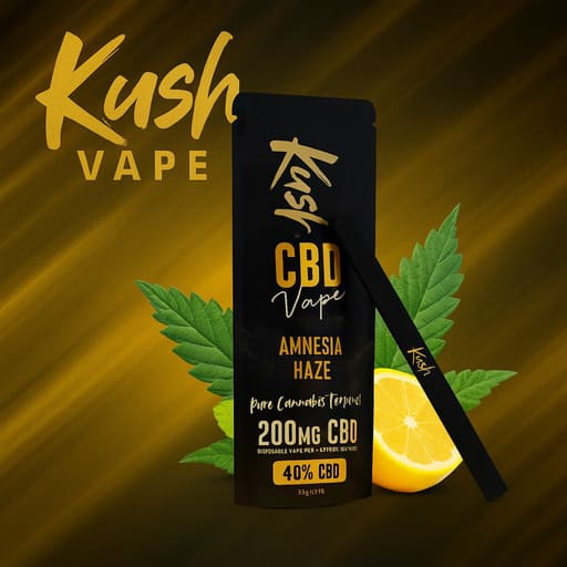 Kush CBD Vape Amnesia Haze jednokratna je elektronska cigareta (vape pen) koja sadrži 40% (200 mg) CBD-a i zajamčeno 0% THC-a. Pruža okus s notama kanabisa, zemljanom i slatkom bazom te izraženim citrusnim tonovima, dobivena od prirodnih terpena (npr. terpinolen, kariofilen, limonen, linalol).