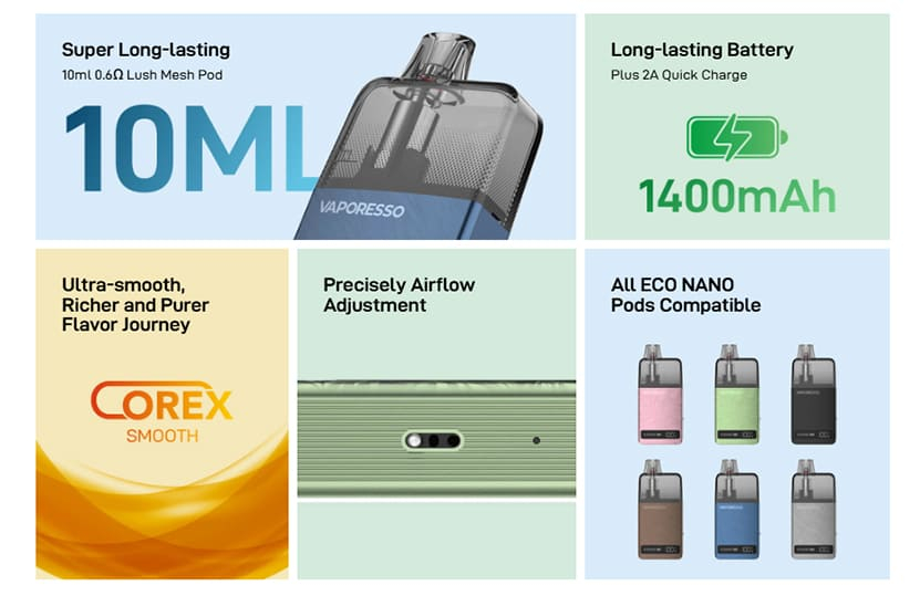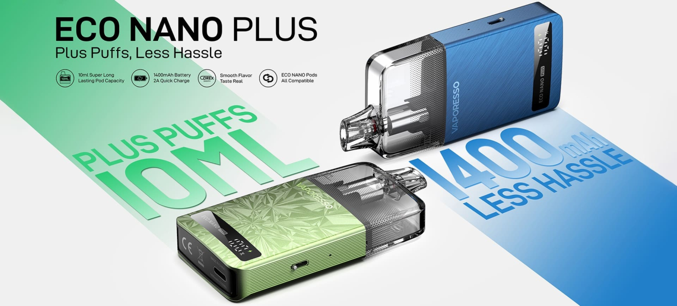 Vaporesso Eco Nano Plus je sustav za e-cigarete s podovima na punjenje s ugrađenom baterijom od 1400mAh i kapacitetom poda od čak 10ml. Odlikuje se jednostavnošću korištenja, automatskim podešavanjem snage i COREX tehnologijom zagrijavanja za poboljšanje okusa.