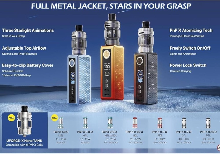 VooPoo Vinci Spark 100 je svestrani mod za e-cigaretu (dostupan i kao kompletan kit) koji nudi izlaznu snagu do 100 W, napaja se jednom eksternom baterijom tipa 18650 (koja se prodaje zasebno) i ističe se svojim jedinstvenim, prilagodljivim LED osvjetljenjem na bočnoj strani uređaja. Mod ima kompaktno kućište od legure cinka s magnetskim bočnim panelom koji skriva 144 LED svjetla, stvarajući efekt zvjezdanog neba koji se aktivira tijekom korištenja, punjenja ili navigacije kroz izbornik. Uređaj ima 0,96-inčni TFT zaslon u boji s dvije prilagodljive teme sučelja (NLO ili Zvijezde padalice), a svjetlosni efekti se po želji mogu isključiti. Tank ima kapacitet od 4,5 ml i praktičan sustav punjenja s kliznim gornjim poklopcem. VooPoo Vinci Spark koristi VooPoo PnP-X seriju grijača, poznatu po dobrom prikazu okusa i dugotrajnosti, kompatibilnu s različitim stilovima parenja, od MTL do DTL.