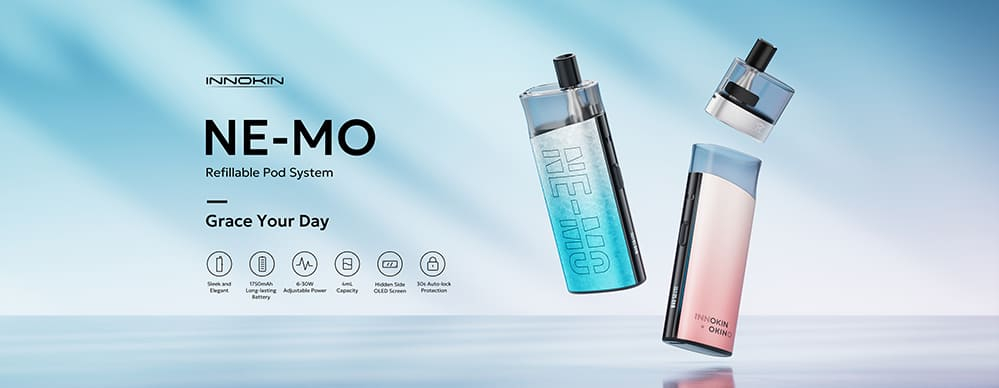 Najnoviji Innokin NE-MO pod komplet je izvrstan izbor za vapere svih razina iskustva koji cijene jednostavne, kvalitetne i elegantne uređaje. Innokin Ne-Mo Kit koristi izdržljivu punjivu bateriju od 1750 mAh s nezamislivo dugim vijekom trajanja i velikim spremnikom od 4ml, što većini vapera omogućuje do 3 dana korištenja između punjenja- idealno za one koji su stalno u pokretu. Innokin Ne-Mo koristi najnovije N POD grijače koji pruzaju dug vijek trajanja i odličan okus tekućina.