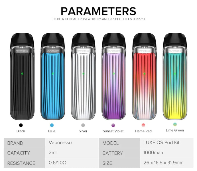 Vaporesso Luxe QS Pod Kit krasi kvalitetno kučište koja daje jedinstven osjećaj u ruci, a precizno podešavanje protoka zraka će zadovoljiti i one najzahtjevnije. Baterija snage 1000mah i spremnik od 3ml će vam pružiti korištenje tijekom cijelog dana. Uzivajte u Corex i Axon tech tehnologiji koja doprinosi dužem trajanju grijača i boljem okusu tekućina. Predivan i luksuzan uređaj TOP kvalitete-odobreno od eRevolucija Shop-a❤️.